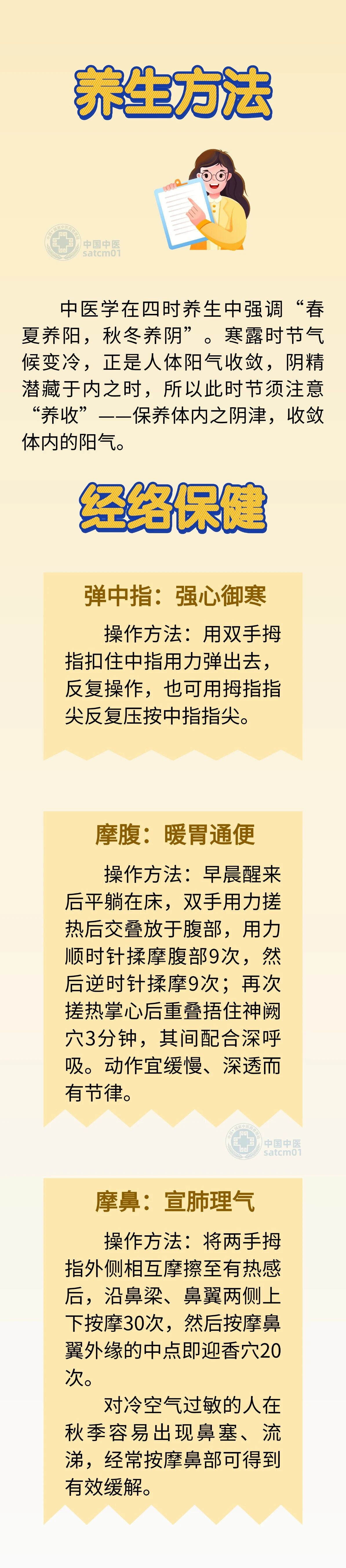 寒露时节气温骤降、空气干燥,养生核心在于防燥邪伤肺与护下焦肾阳,避免受凉感冒,防止因秋燥引发口干、皮肤干等问题。此时除了添衣保暖、早睡养阴,还可以通过经络保健与药膳调理来应对秋燥不适。