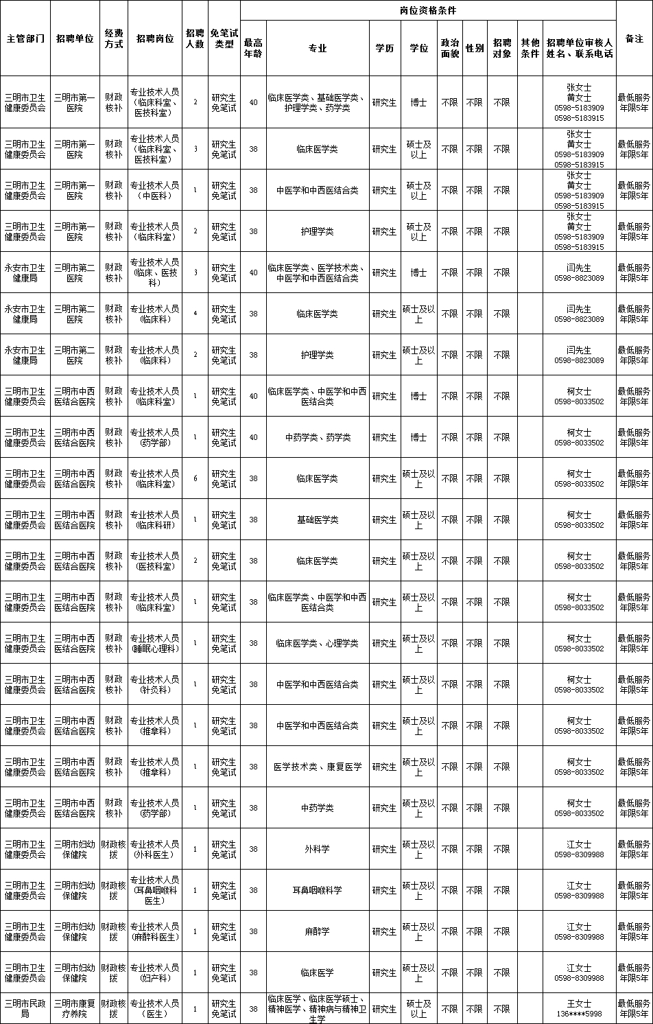 本次三明市市直医疗事业单位面向社会公开招聘2026届医疗高层次人才39名,招聘信息在三明市人力资源和社会保障局网站(http://rsj.sm.gov.cn)、三明市卫生健康委员会网站(http://wjw.sm.gov.cn)和各招聘单位网站发布,招聘岗位、招聘人数、资格条件等要求如下: